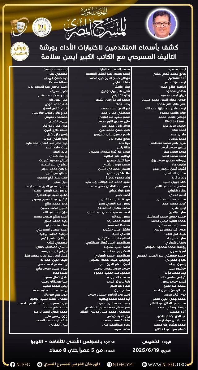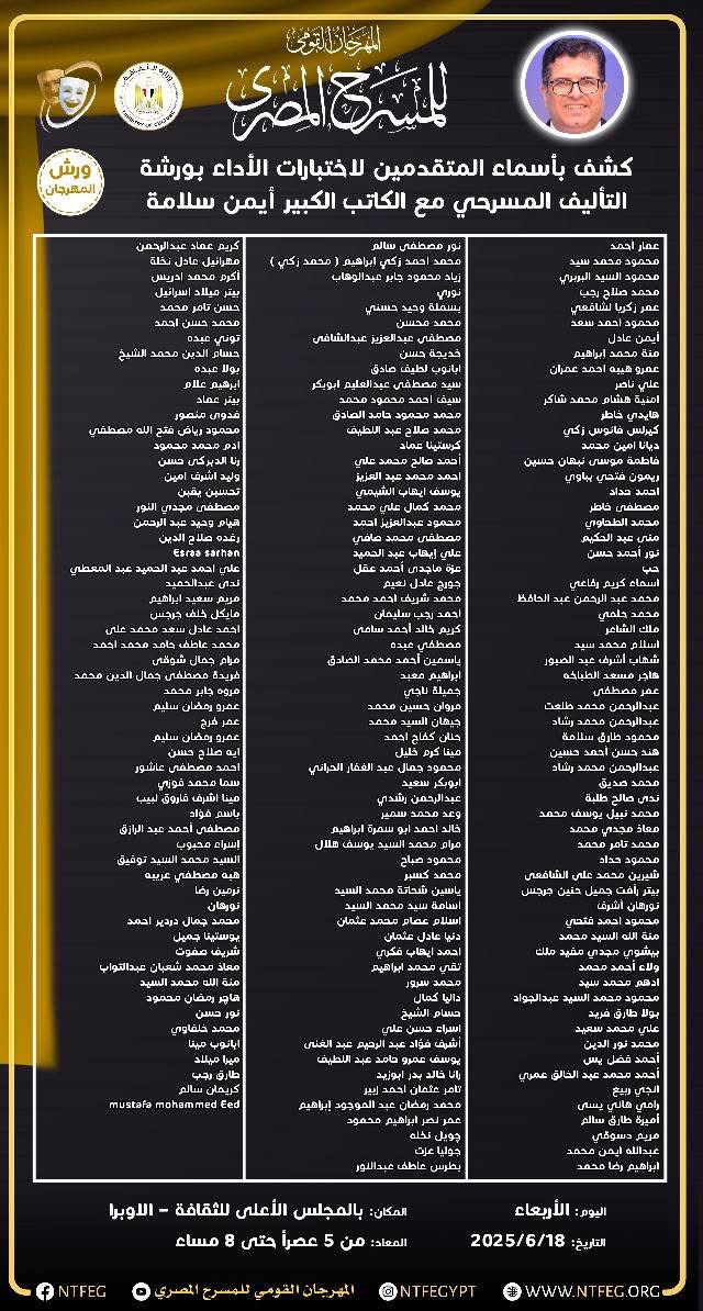 كشف المهرجان القومي للمسرح المصري في دورته الثامنة عشرة، برئاسة الفنان محمد رياض، عن أسماء المتقدمين لورشة التأليف المسرحي والتي يقدمها الكاتب أيمن سلامة، ضمن فعاليات المهرجان هذا العام. ورشة التأليف المسرحي بالمهرجان القومي للمسرح