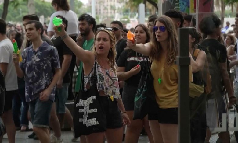 وأطلق بعض المتظاهرين مسدسات الماء والمشاعل الملونة، ووضع ملصقات “دفاع الحي عن النفس، عودوا إلى دياركم أيها السائحون” على واجهات المتاجر والفنادق، يشار إلى أن برشلونة، التي يبلغ عدد سكانها 1.6 مليون نسمة، استقبلت 26 مليون سائح العام الماضي.