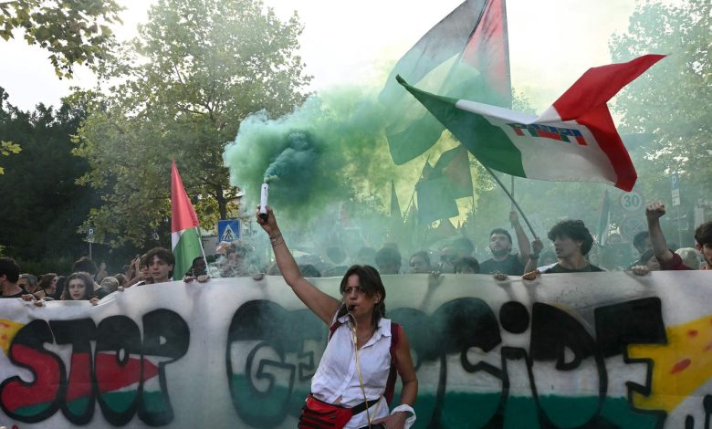ورفعت خلال التظاهرة التي دعت إليها منظمات يسارية في منطقة البندقية، لافتات تدعو إلى مقاطعة إسرائيل و”وضع حد للإبادة” وسط عدد كبير من الأعلام الفلسطينية.