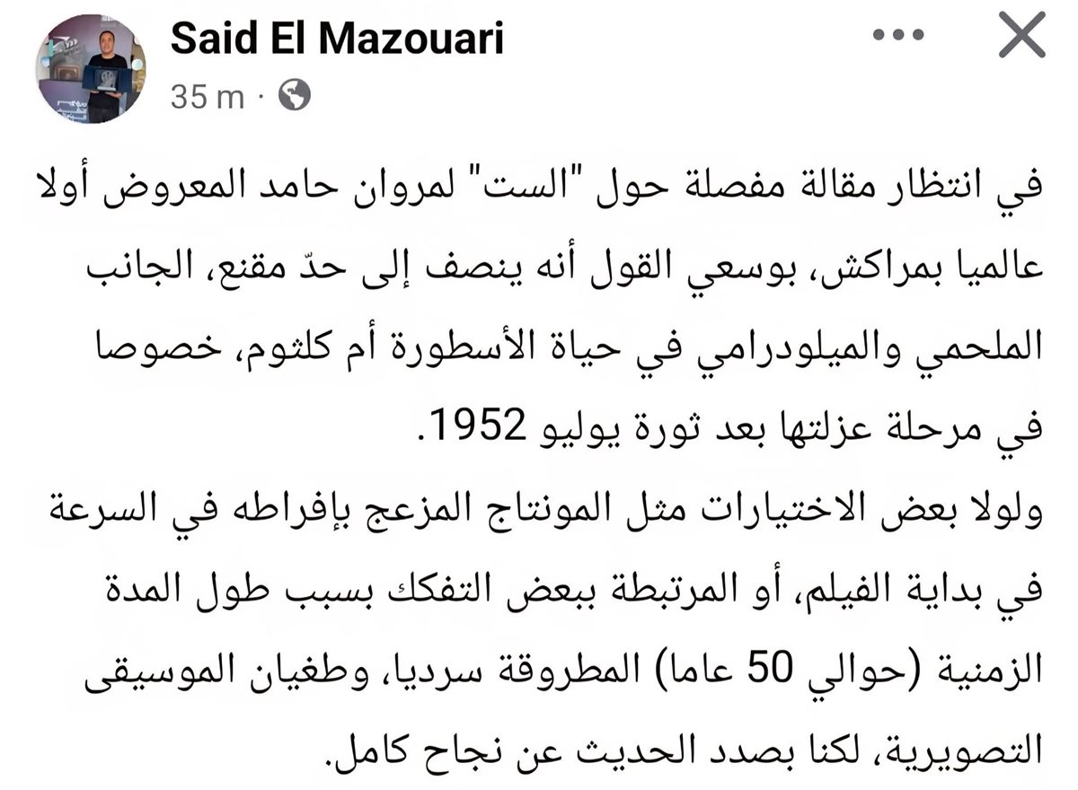 وكتب سعيد المزواري: “في انتظار مقالة مفصلة حول “الست” لمروان حامد المعروض أولا عالميا بمراكش، بوسعي القول أنه ينصف إلى حد مقنع، الجانب الملحمي والميلودرامي في حياة الأسطورة أم كلثوم، خصوصا في مرحلة عزلتها بعد ثورة يوليو 1952.