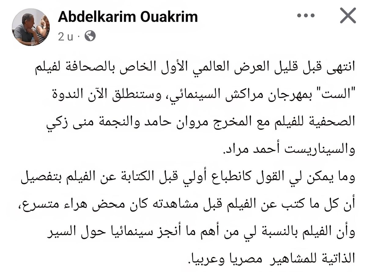بينما كتب الناقد المغربي عبد الكريم واكريم: “انتهى قبل قليل العرض العالمي الأول الخاص بالصحافة لفيلم “الست” بمهرجان مراكش السينمائي، وستنطلق الآن الندوة الصحفية للفيلم مع المخرج مروان حامد والنجمة منى زكي والسيناريست أحمد مراد.