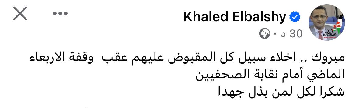 كشف نقيب الصحفيين خالد البلشي، عن اخلاء سبيل كافة الصحفيين الذين تم إلقاء القبض عليهم يوم الاربعاء الماضي عقب الوقفة التي تم تنظيمها أمام نقابة الصحفيين .