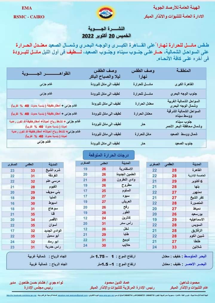 كشفت الهيئة العامة للأرصاد الجوية، تفاصيل حالة الطقس، التي تشهدها البلاد غدا الخميس 20 أكتوبر عام 2022، وسط استمرار فرص سقوط الأمطار على بعض المناطق.