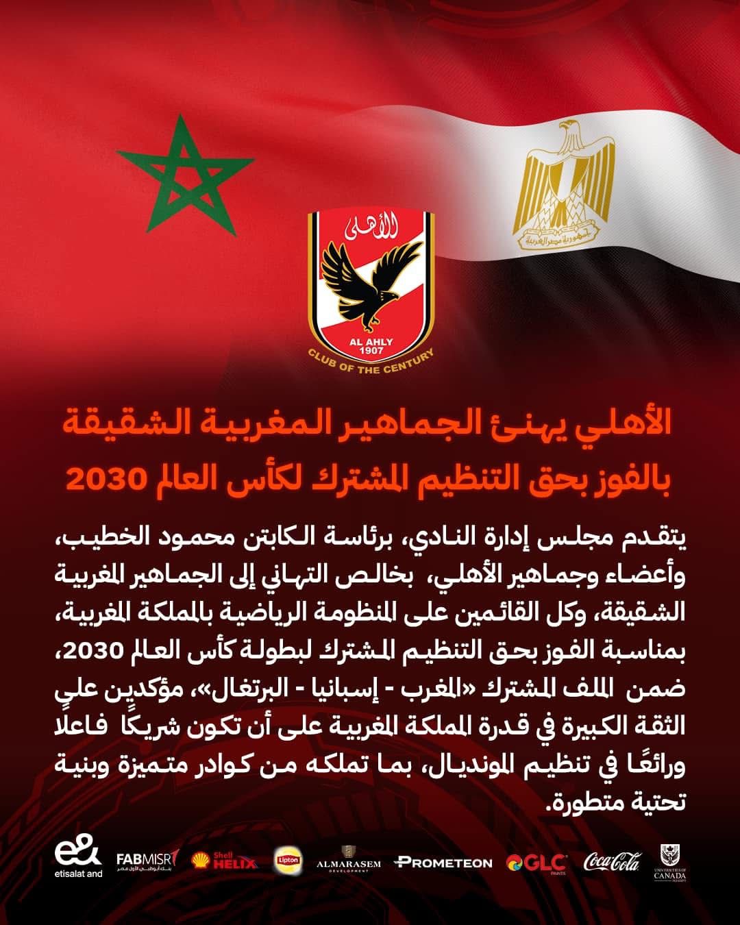 يتقدم مجلس إدارة النادي الأهلي، برئاسة محمود الخطيب وأعضاء وجماهير الأهلي بخالص التهاني إلى الجماهير المغربية الشقيقة، وكل القائمين على المنظومة الرياضية بالمملكة المغربية بمناسبة الفوز بحق التنظيم المشترك لبطولة كأس العالم 2030، ضمن الملف المشترك «المغرب – إسبانيا – البرتغال».