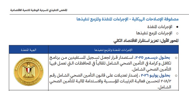 كشف الملخص التنفيذي للسردية الوطنية للتنمية الاقتصادية، أن الحكومة ستصدر قرارا بحلول يوليو 2026، بتعديل قانون التأمين الصحي الشامل رقم 2/2018 لتحسـين فعالية الترتيبات المؤسسية والاستدامة المالية للتأمين الصحي الشامل.