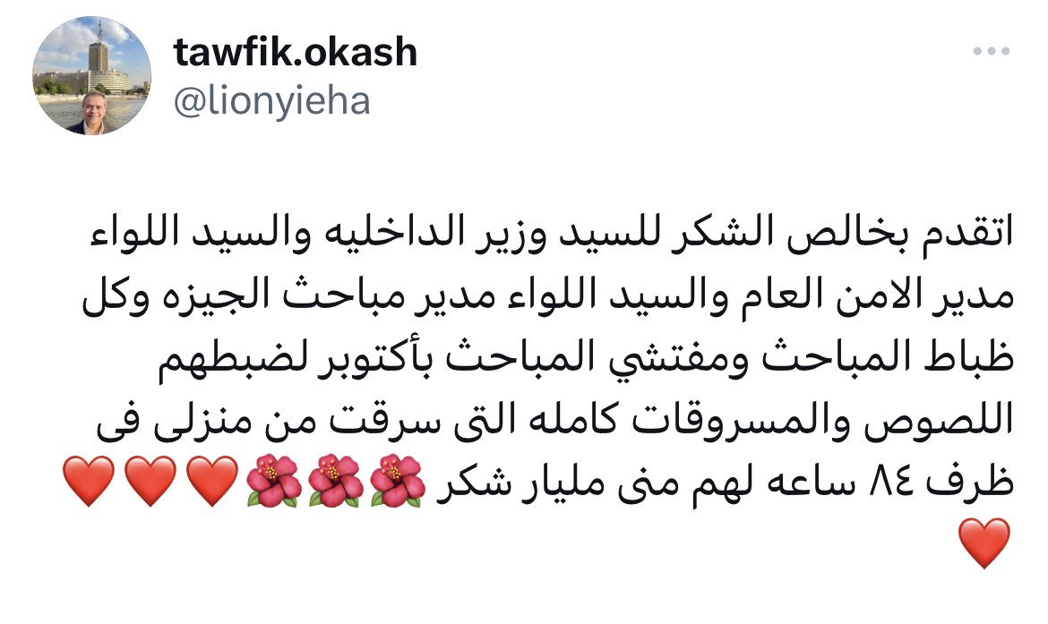 ووجه الإعلامي توفيق عكاشة الشكر لوزارة الداخلية بعد القبض على المتهمين قائلا: “اتقدم بخالص الشكر للسيد وزير الداخلية والسيداللواء مدير الامن العام والسيد اللواء مدير مباحث الجيزة وكل ظباط المباحث ومفتشي المباحث بأكتوبر لضبطهم اللصوص والمسروقات كاملهالتى سرقت من منزلى فى ظرف ٨٤ ساعه لهم منى مليار شكر”