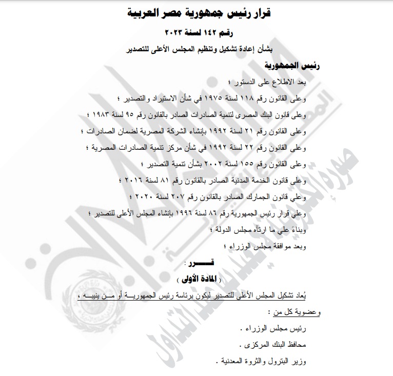أصدر الرئيس عبد الفتاح السيسى، القرار رقم 142 لسنة 2023 بشأن إعادة تشكيل وتنظيم المجلس الأعلى للتصدير.