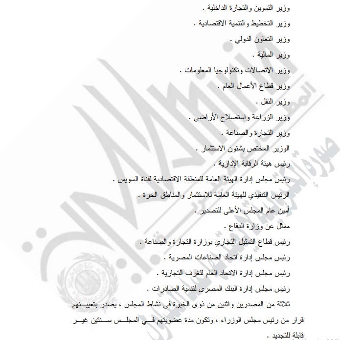 وتضمن الأعضاء أيضا كل من “رئيس مجلس إدارة الهيئة العامة للمنطقة الاقتصادية لقناة السويس، والرئيس التنفيذى للهيئة العامة للاستثمار والمناطق الحرة، وأمين عام المجلس الأعلى للتصدير، وممثل عن وزارة الدفاع، رئيس قطاع التمثيل التجاري بوزارة التجارة والصناعة، رئيس مجلس إدارة اتحاد الصناعات المصرية، رئيس مجلس إدارة الاتحاد العام للغرف التجارية، رئيس مجلس إدارة البنك المصرى لتنمية الصادرات، إضافة إلى ثلاثة من المصدرين واثنين من ذوي الخبرة فى نشاط المجلس يصدر بتعيينهم قرار من رئيس محلس الوزراء وتكون مدة عضويتهم فى المجلس سنتين غير قابلة للتجديد.
