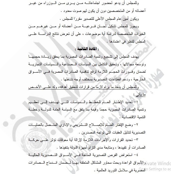 وتضمن القرار أن يعاد تشكيل المجلس الأعلى للتصدير برئاسة رئيس الجمهورية وعضوية كل من: رئيس الوزراء- محافظ البنك المركزى- ووزراء البترول والتموين والتخطيط والتعاون الدولي والمالية والاتصالات وقطاع الأعمال العام والنقل والزراعة والصناعة، والوزير المختص بشئون الاستثمار، ورئيس هيئة الرقابة الإدارية”.