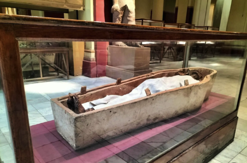 عرض المتحف المصري بالتحرير، قطعة أثرية نادرة عبارة عن صندوق من الخوص يحتوى بداخله على مومياء في وضع القرفصاء ترجع للعصر العتيق.