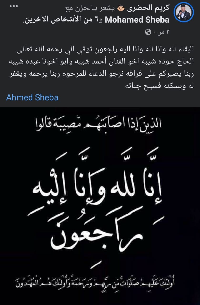 وكتب آخر عبر موقع التواصل الاجتماعي “فيسبوك”: “توفي إلى رحمة الله تعالى محمود شيبة شقيق الفنان أحمد شيبة، وتشيع الجنازة عقب صلاة الظهر من مسجد حسان بالقباري، ولا يريكم الله مكروها في عزيز لديكم”.