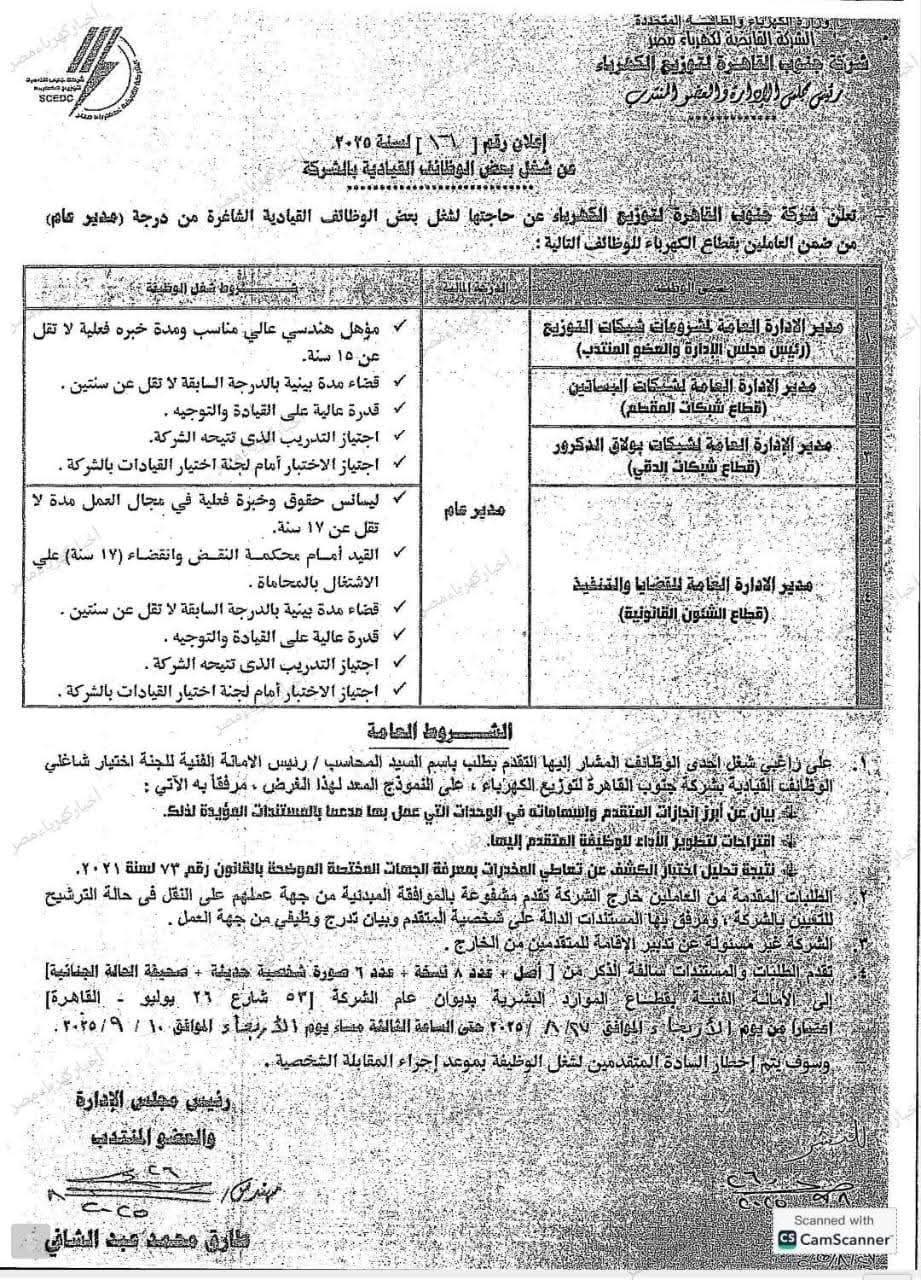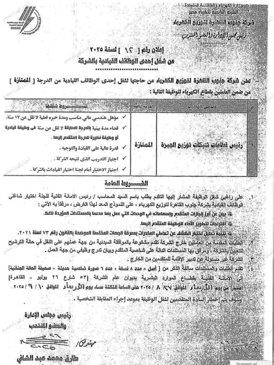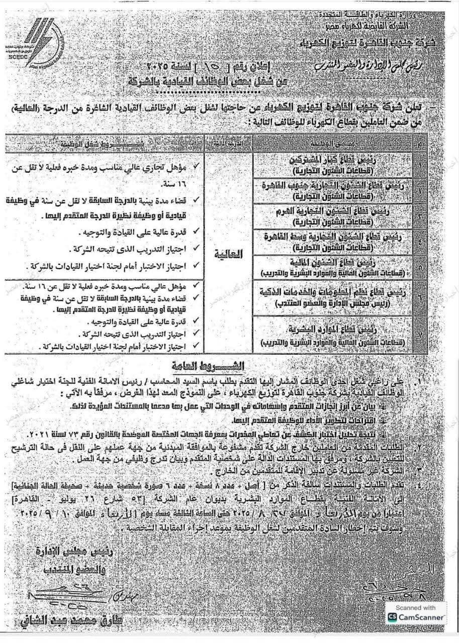 أعلنت شركة جنوب القاهرة لتوزيع الكهرباء، برئاسة المهندس طارق عبد الشافي، اليوم الأربعاء، عن حاجتها لشغل بعض الوظائف القيادية.