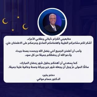 بعد شائعة وفاته.. د. حسام موافي يهنئ جمهوره ومتابعيه بحلول شهر رمضان