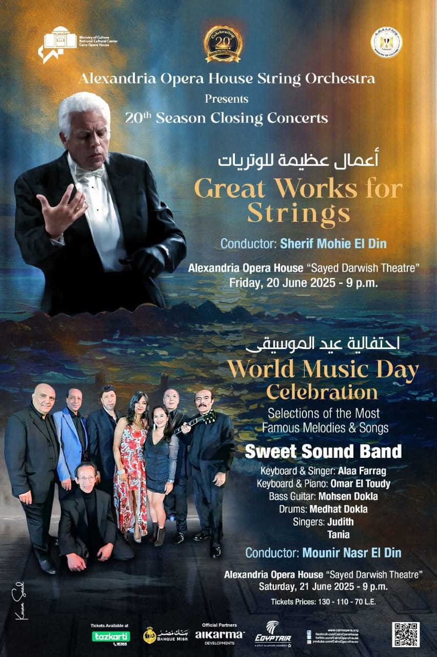 أما مسرح سيد درويش “أوبرا الإسكندرية” يضم حفلات لكل من فرقة أوبرا الإسكندرية للموسيقى والغناء العربى بقيادة المايسترو أحمد عامر يتضمن باقة من أعمال الموسيقار بليغ حمدى ، ويقدم أوركسترا وتريات أوبرا الإسكندرية حفلان أحدهما بقيادة المايسترو شريف محى الدين ويضم أعمال عظيمة للوتريات والٱخر بمناسبة عيد الموسيقى ومشاركة سويت ساوند باند قيادة المايسترو منير نصر الدين .