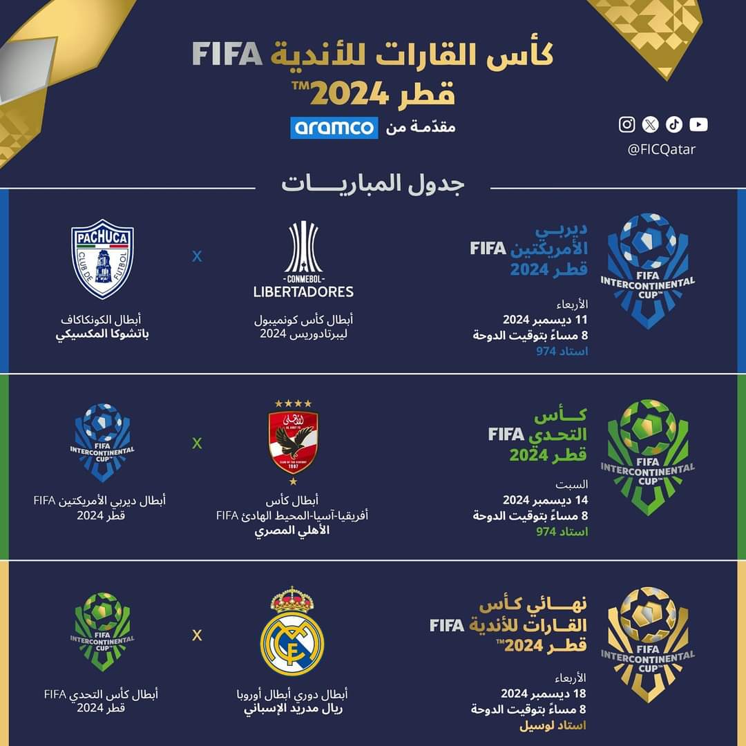 وتستضيف العاصمة القطرية الدوحة، نهائيات كأس الإنتركونتيننتال خلال الفترة من 11 حتى 18 ديسمبر المقبل، وذلك بمشاركة: الأهلي، ريال مدريد، باتشوكا المكسيكي، بطل كوبا ليبرتادوريس.