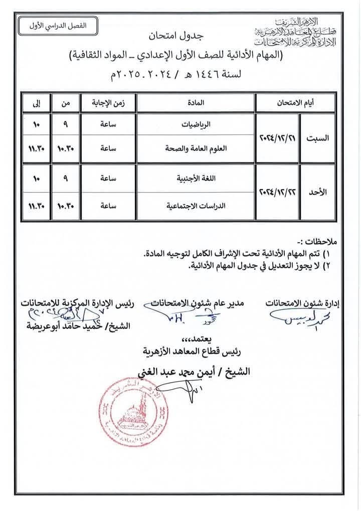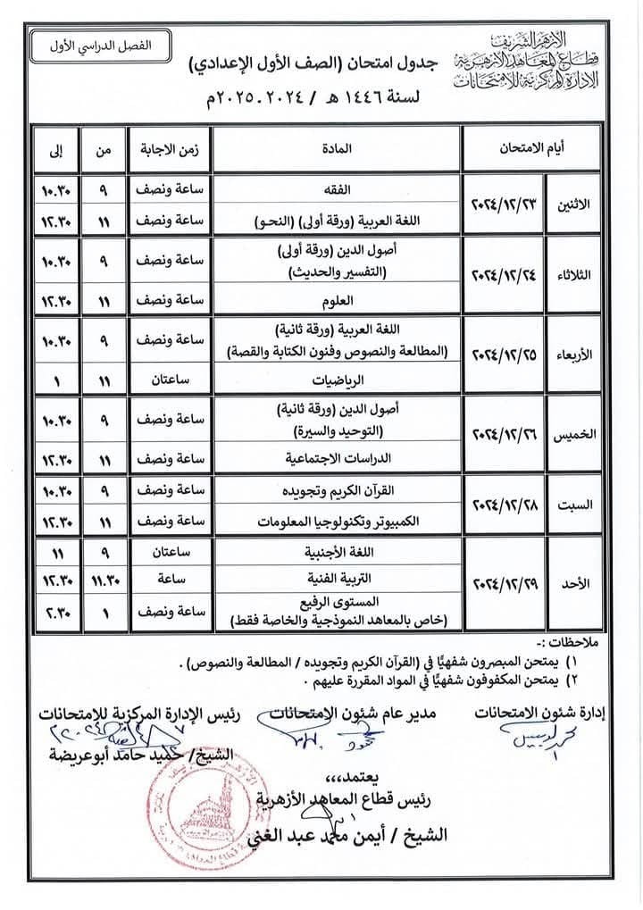 جدول امتحانات الصف الأول الإعدادي الأزهري 2024