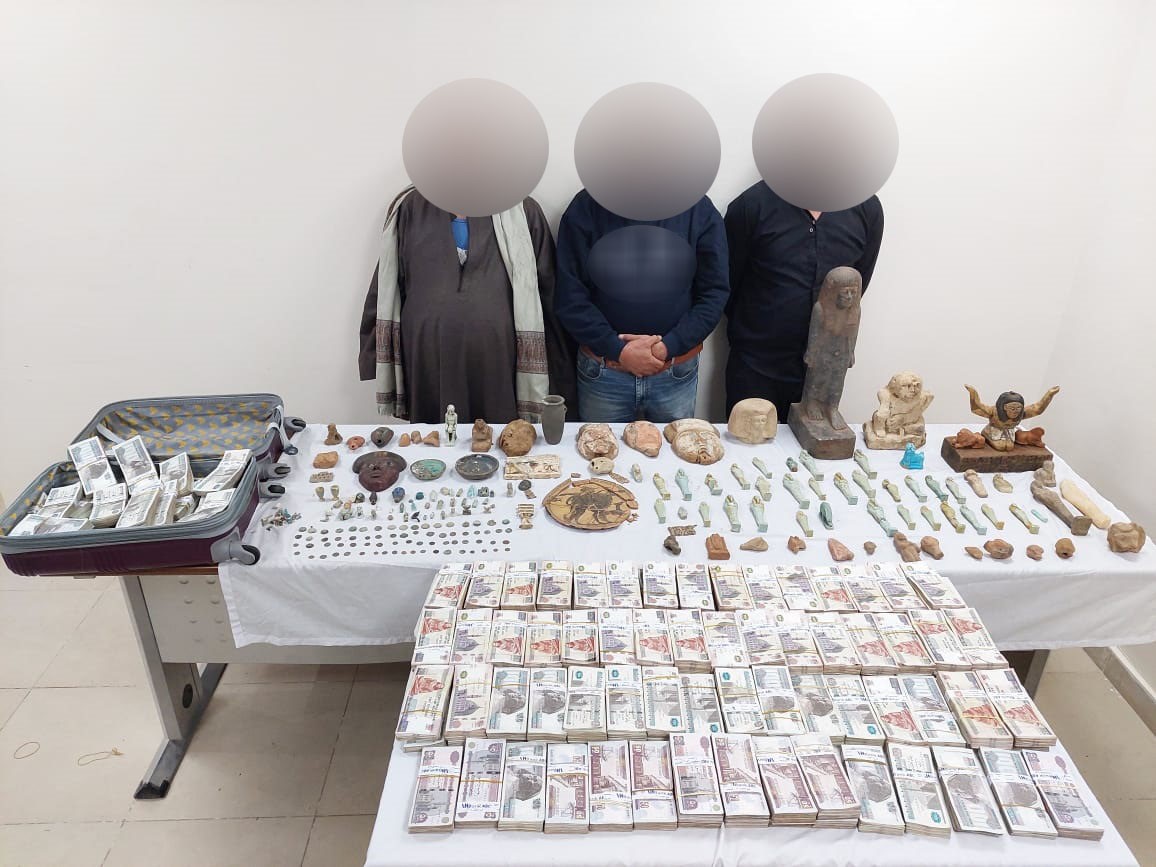 وضبط بحوزة الأخير مبلغ مالي قدره مليون وخمسمائة ألف جنيه، وبتفتيش السيارة المشار إليه عُثر على 201 قطعة يُشتبه في أثريتها مختلفة الأشكال والأحجام وتم اتخاذ الإجراءات القانونية.