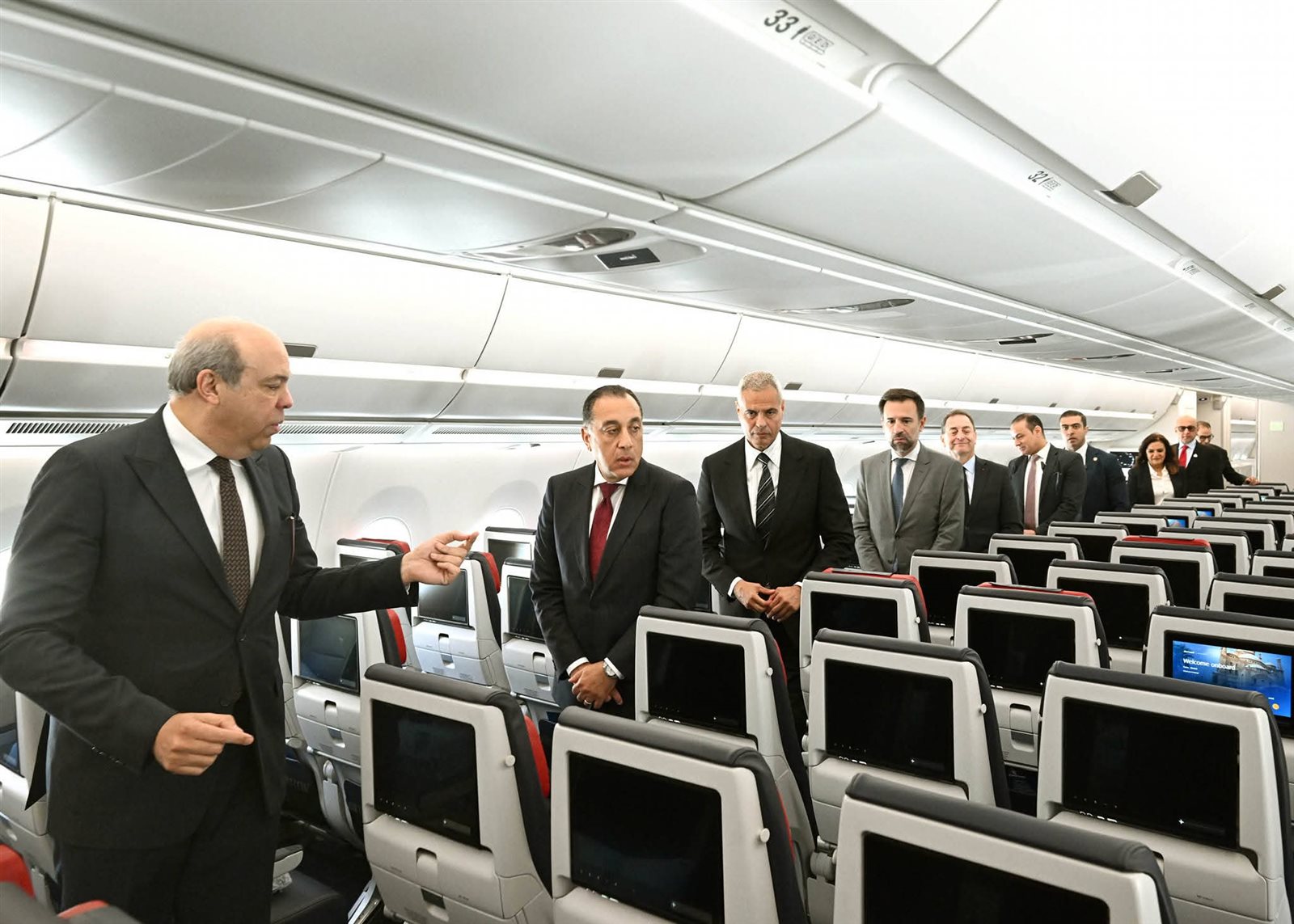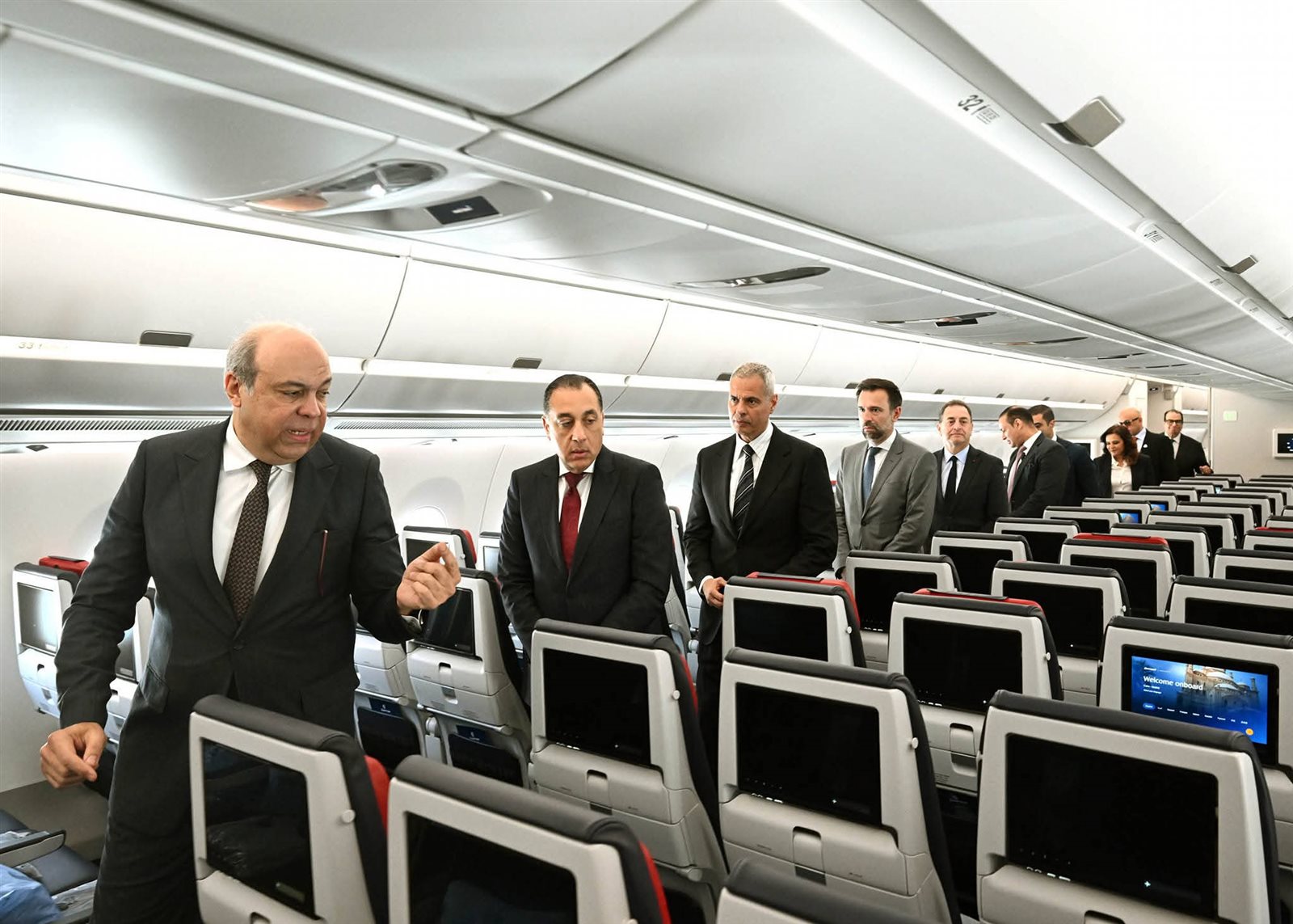 خلال فعاليات الاحتفال بانضمام أول طائرة من طراز Airbus A350-900 إلى أسطول الناقل الوطني، تفقد الدكتور مصطفى مدبولي، رئيس مجلس الوزراء، ومرافقوه، الطائرة الجديدة منAirbus ، التى تأتي ضمن صفقة أبرمتها شركة “مصر للطيران” مع شركة “Airbus” لضم 16 طائرة من طراز A350-900 للأسطول الوطني.