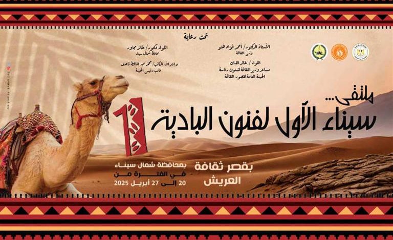 تنطلق غدا الأحد، بقصر ثقافة العريش، فعاليات “ملتقى سيناء الأول لفنون البادية”، تحت رعاية وزير الثقافة الدكتور أحمد فؤاد هنو، ومحافظ شمال سيناء الدكتور خالد مجاور، وتنظمه الهيئة العامة لقصور الثقافة برئاسة خالد اللبان، احتفالا بالذكرى الـ 43 لتحرير سيناء.