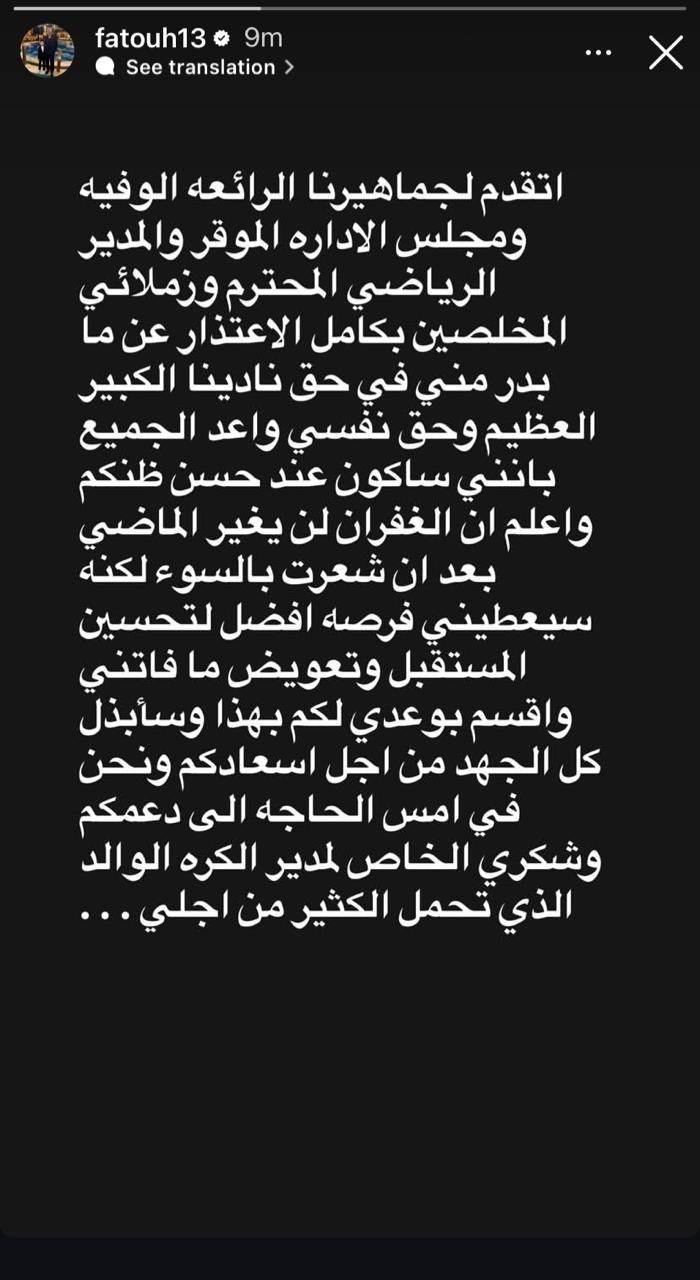 وكتب فتوح عبر حسابه الرسمي على موقع التواصل الاجتماعي “إنستجرام”:اتقدم لجماهيرنا الرائعة الوفية، ومجلس الإدارة الموقر والمدير الرياضي المحترم وزملائي المخلصين بكامل الاعتذار عن ما بدر مني في حق نادينا الكبير العظيم وحق نفسي”.