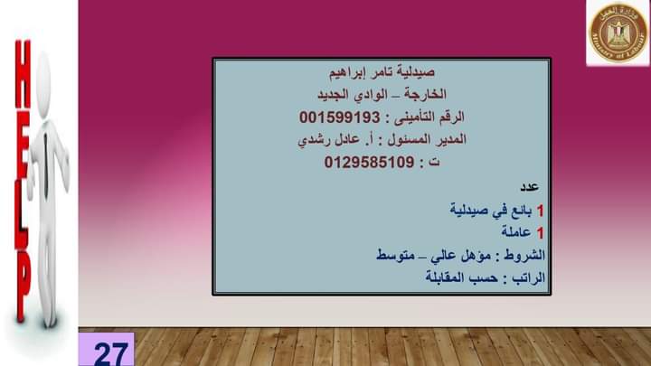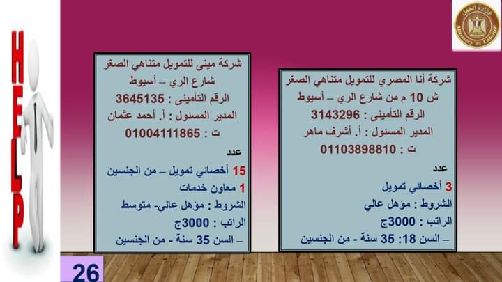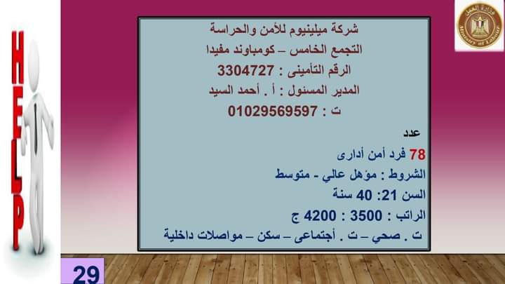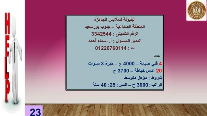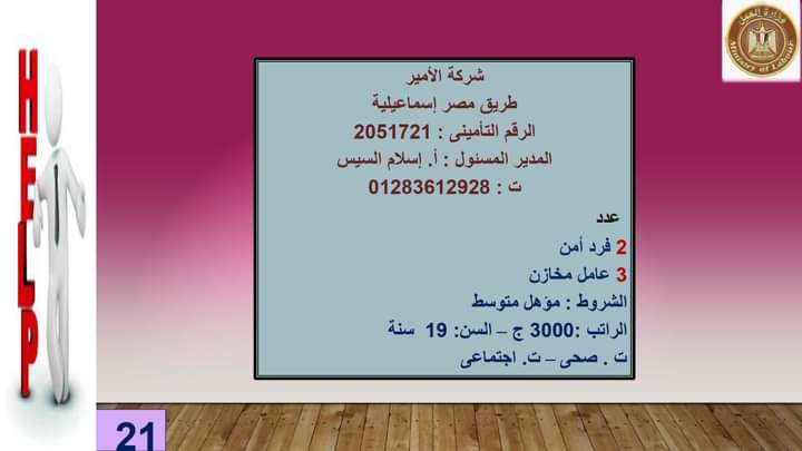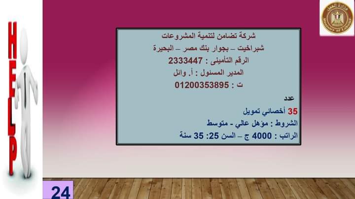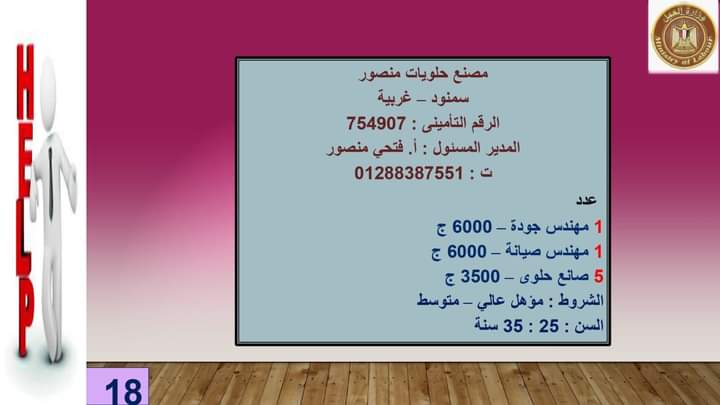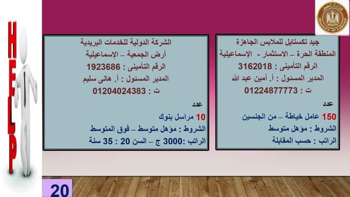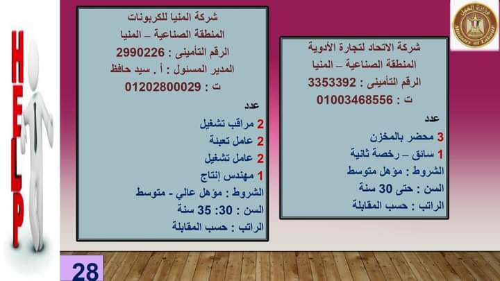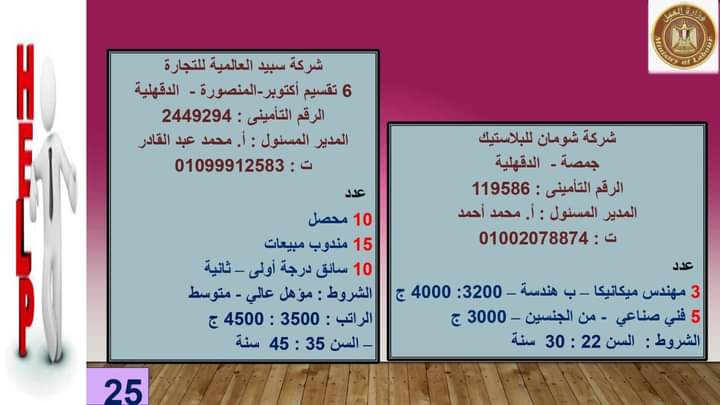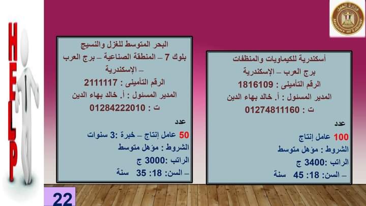 وبحسب البيان قالت “الوزارة” أن نشرة التوظيف الدورية تصدر كل 15 يوم، من خلال الإدارة العامة للتشغيل برئاسة هبه أحمد مدير عام التشغيل بالوزارة، وإعداد منى شوقي باحث أول بـ”الإدارة”، تُعلن اليوم الجمعة عن فُرص عمل جديدة،مُتوفرة في 14 محافظة،هي: القاهرة، والجيزة ، وأسيوط ، ودمياط ، وبورسعيد، والأسكندرية ،والغربية، والقليوبية ، والدقهلية ، والمنيا ، والوادى الجديد ، والإسماعيلية ، والشرقية ،والبحيرة..و في تخصصات: مدرسين جميع التخصصات،ومدير فرع ، واخصائيين تمويل،و مسئول موارد بشرية،ومحاسبين،ومندوبين مبيعات وتوصيل، ومهندسين كهرباء وإنتاج وميكانيكا، ومراقبين جودة ، وعمال خدمات بترولية ، وكيميائيين ، ومدخل بيانات ، ومراسل بنوك ، وفنيين جميع التخصصات، ومشرفي إنتاج ، وأفراد أمن ،وسائقين، ووسطاء تأمين، وعمال خياطة بكافة الأقسام ،وعمال انتاج ، وعمال نظافة، وتخصصات أخرى . .لوظائف لذوى همم بالمحافظات