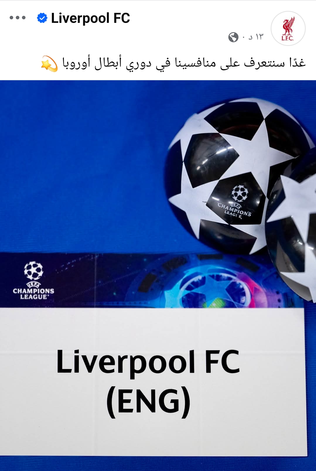 ونشرت الصفحة الرسمية لفريق ليفربول عبر منصات وسائل التواصل الإجتماعي صورة للكرة الرسمية لبطولة دوري أبطال أوروبا وعلقت عليها: غدًا سنتعرف على منافسينا في دوري أبطال أوروبا.