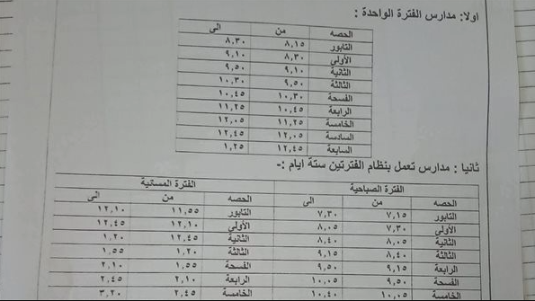 أما المدارس التي تعمل بنظام الفترتين، فقد تم تقسيم اليوم الدراسي إلى فترة صباحية وأخرى مسائية، مع الالتزام بتقليص عدد الساعات اليومية، وتنظيم الفواصل الزمنية بين الحصص، لضمان سير اليوم الدراسي بسلاسة دون الإخلال بالخطة الدراسية.