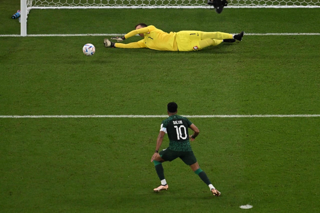 وفي الدقيقة 45، أهدر سالم الدوسري ركلة جزاء للمنتخب السعودي، حيث تصدى لها تشيزني حارس منتخب بولندا، وأضاع بذلك فرصة تعديل النتيجة للأخضر قبل الدخول إلى غرف الملابس بين شوطي اللقاء.