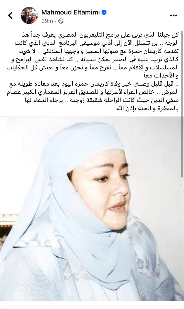 وكتب محمود التميمي، منشورًا عبر حسابه الشخصي بموقع فيسبوك، وقال: كل جيلنا الذي تربى على برامج التليفزيون المصري يعرف جدًا هذا الوجه.. بل تتسلل الآن إلى أذني موسيقى البرنامج الديني الذي كانت تقدمه كاريمان حمزة مع صوتها المميز ووجهها الملائكي.. لا شيء كالذي تربينا عليه في الصغر يمكن نسيانه.