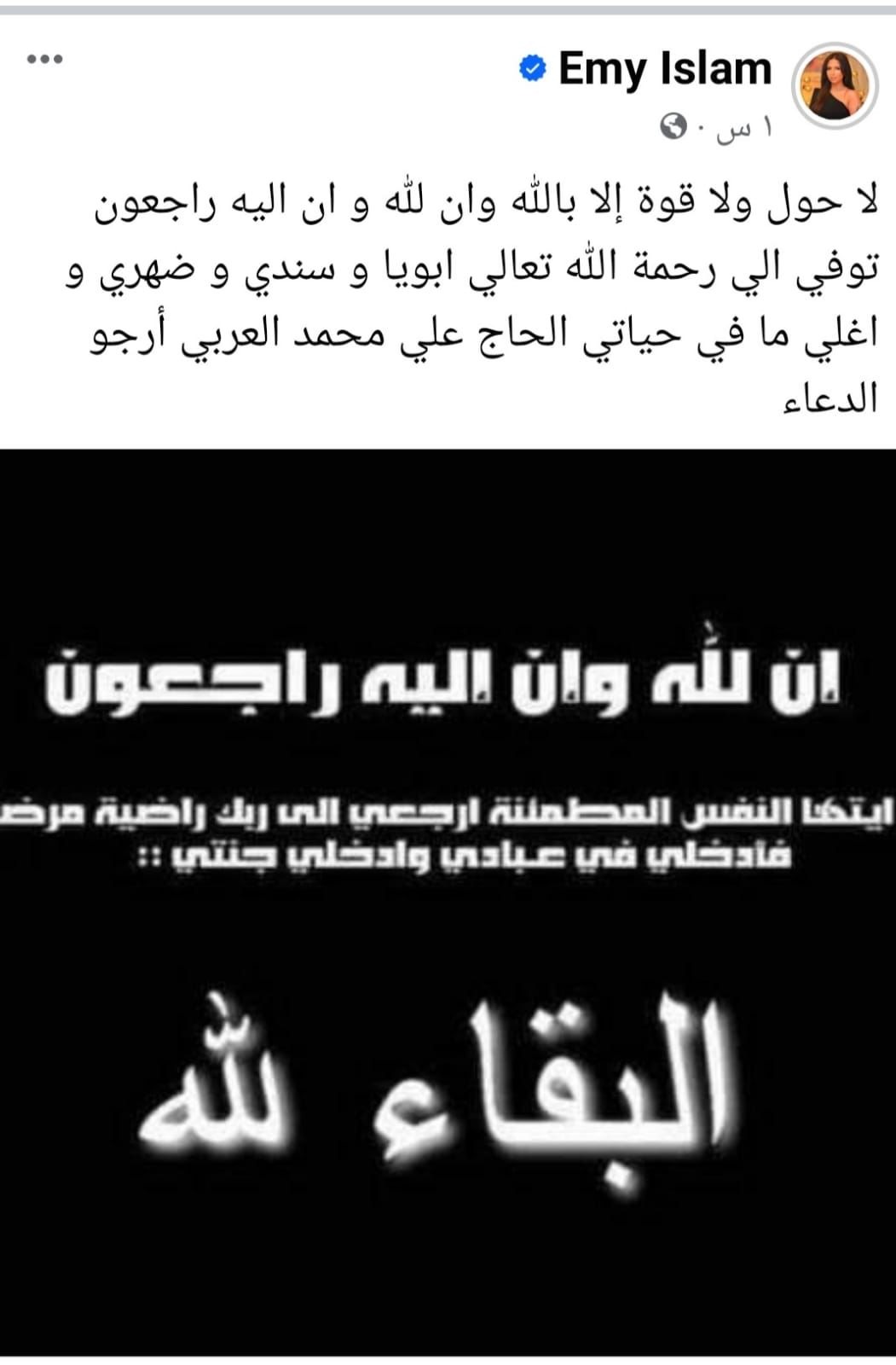 وكتبت إيمي إسلام عبر حسابها على فيسبوك، الآتي: لا حول ولا قوة إلا بالله وإنا لله وإنا إليه راجعون.. توفي إلى رحمة الله تعالى أبويا وسندي وضهري وأغلى ما في حياتي الحاج علي محمد العربي.. أرجو الدعاء.