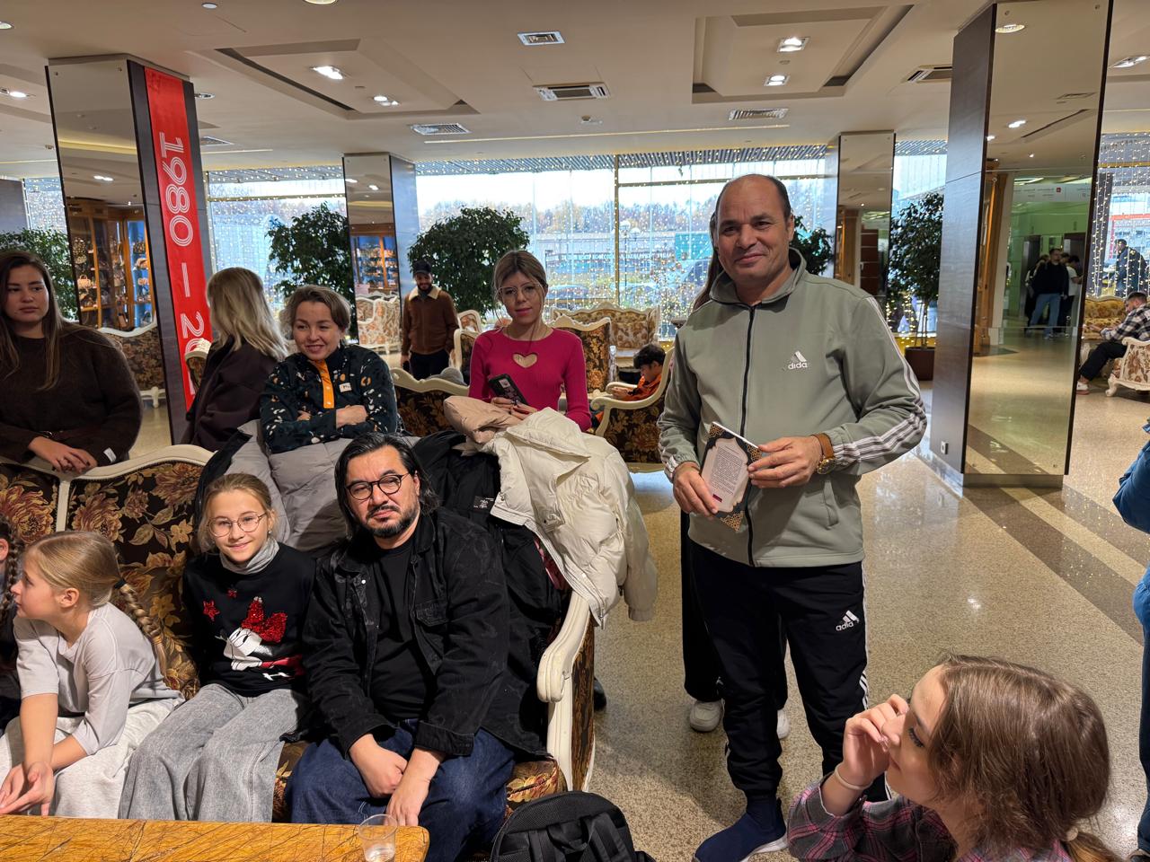 كما فتحت البعثة نقاشا ثريا مع أحد المعلمين الروس وتلاميذه على هامش دورة تدريبية للمدرسة داخل فندق ألفا بالعاصمة الروسية موسكو.
